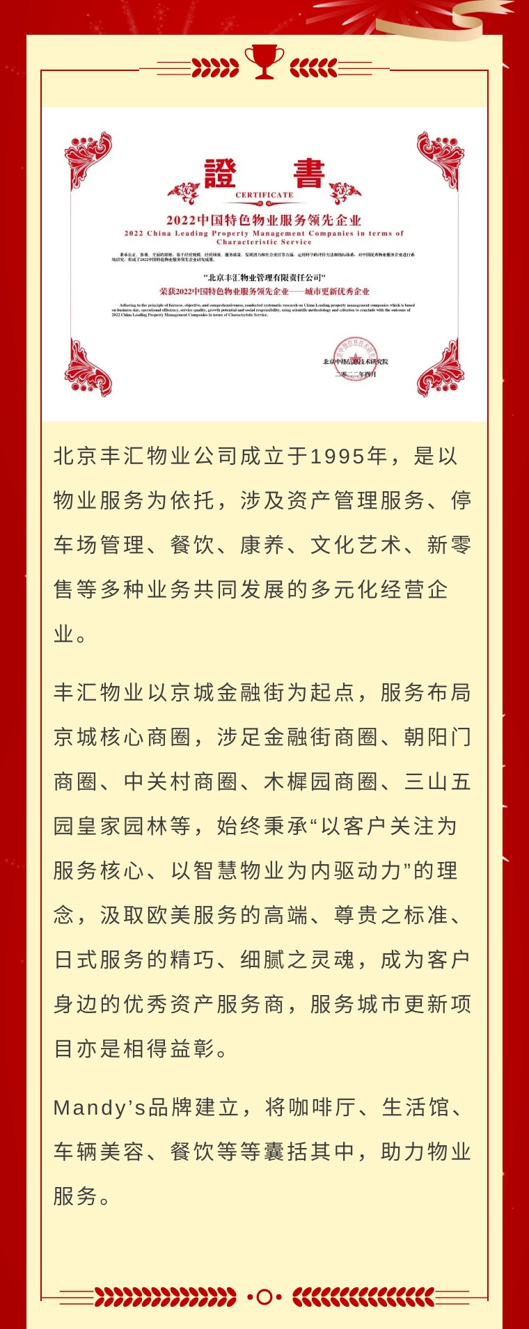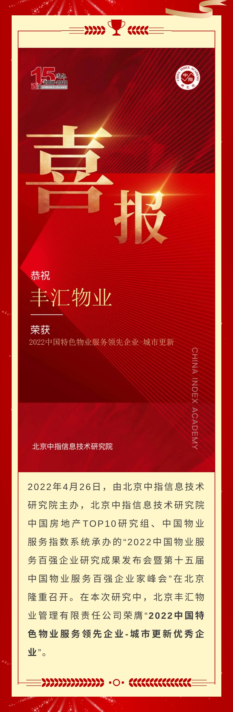 豐匯物業(yè)榮膺“2022中國特色物業(yè)服務(wù)領(lǐng)先企業(yè)-城市更新優(yōu)秀企業(yè)”